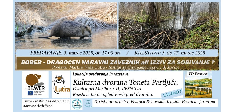 Ta ponedeljek, 3. marca 2025, vas vabimo na predavanje o sobivanju z bobrom! Dogodek bo ob 17. uri v Kulturni dvorani Toneta Partljiča v Pesnici.